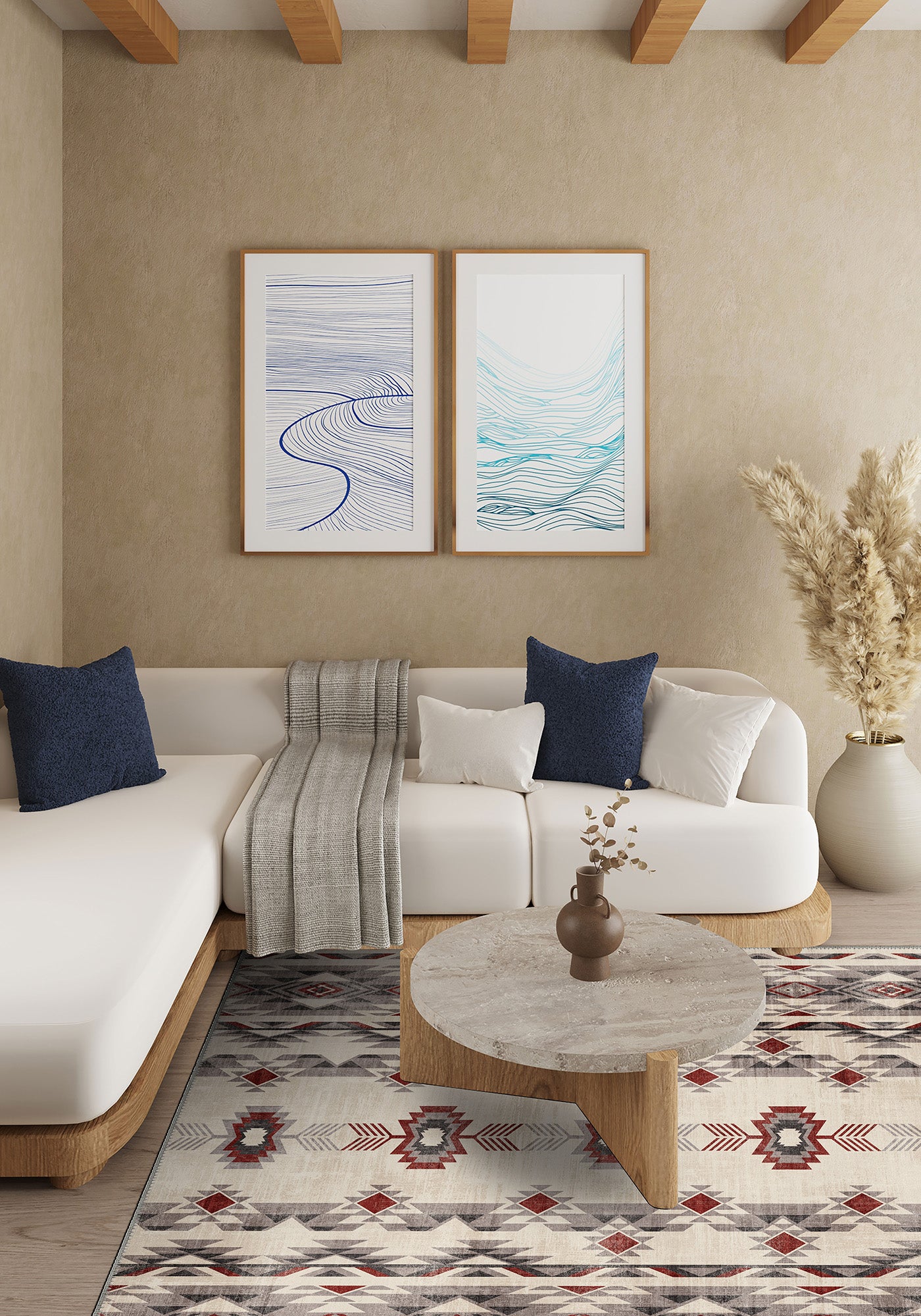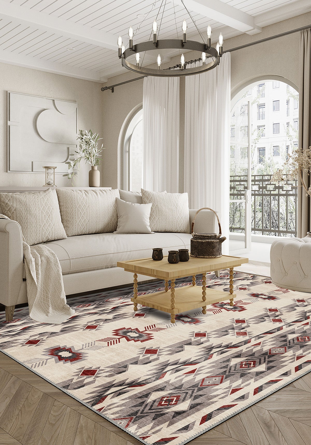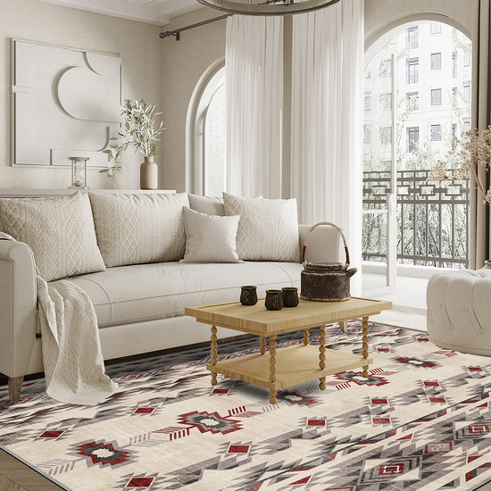 The Dakota Beige Navajo Rug belongs to our washable rugs collection, combining heritage-inspired design with modern practicality. Its low-profile construction allows furniture to sit comfortably, while the durable weave ensures it stands up beautifully in busy households.