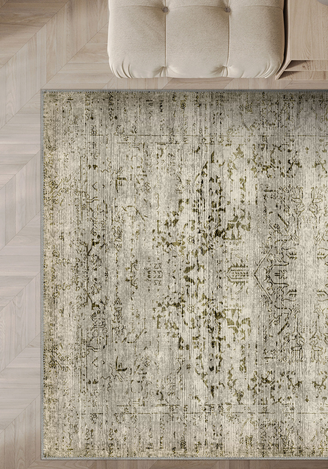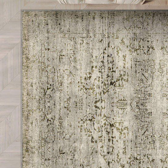 The Hudson Green Beige Medallion Washable Rug blends traditional medallion patterns with soothing green and beige tones. Its distressed finish adds vintage charm while complementing modern spaces. Perfect for adding a subtle yet stylish touch to any room.