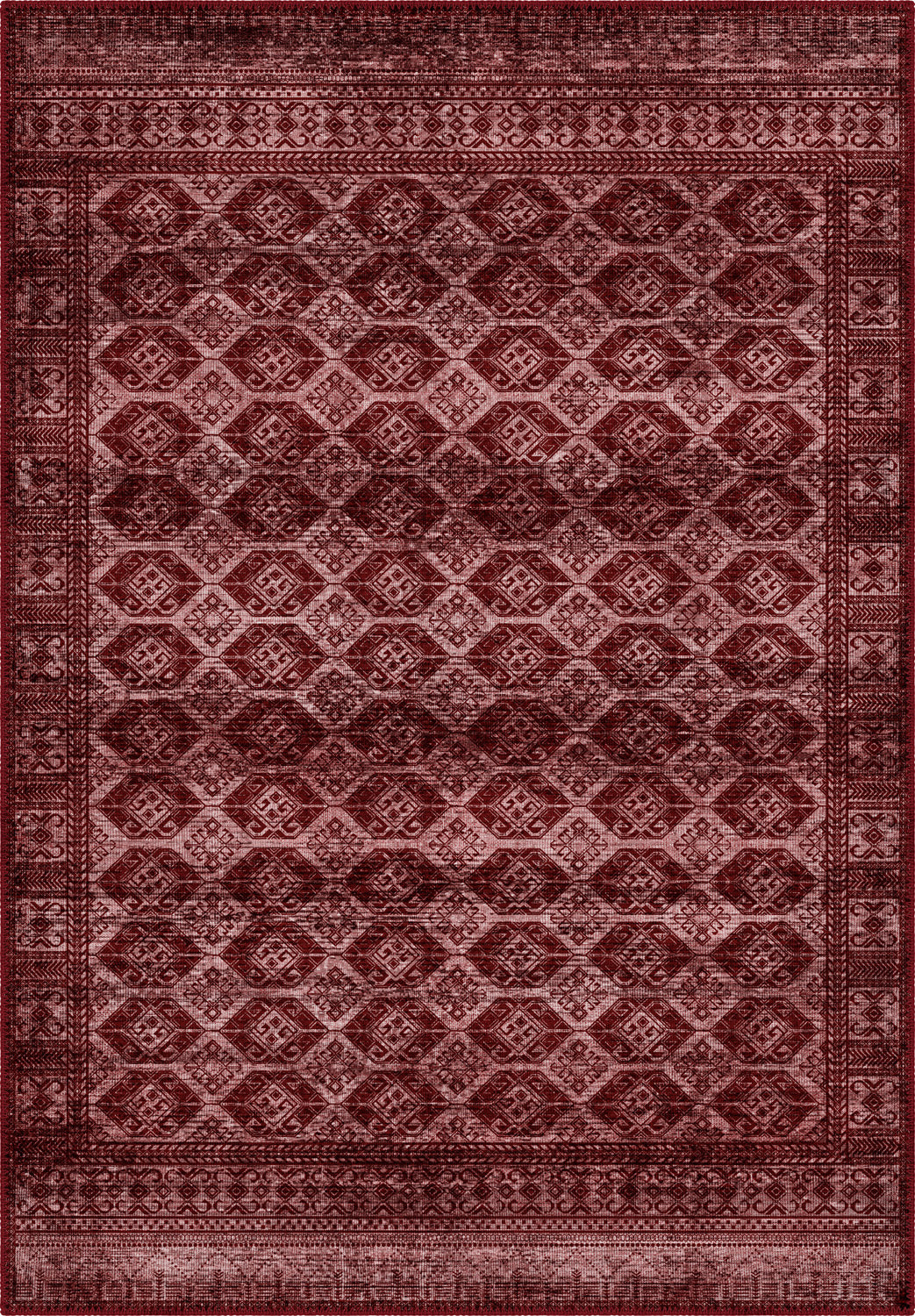 Infused with timeless beauty, the Larona Burgundy Traditional Rug embodies classic sophistication with its intricate lattice pattern and elegantly framed border. The deep burgundy hues, enriched with subtle distressing, create an inviting warmth, making this rug a stunning focal point for any interior.