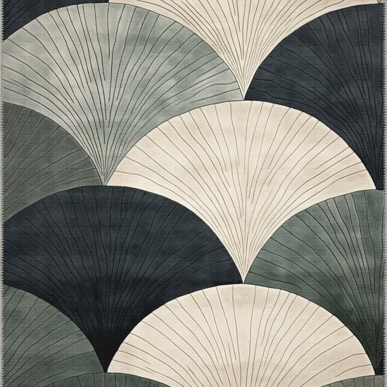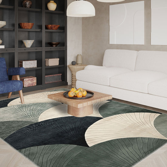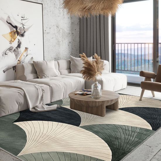 The Orin Modern Washable Rug delivers a bold statement in any room, thanks to its layered fan motif in subtle shades of beige, charcoal, and green. This contemporary design is perfect for modern homes that crave a touch of artistic flair while benefiting from the practicality of a machine-washable material.
