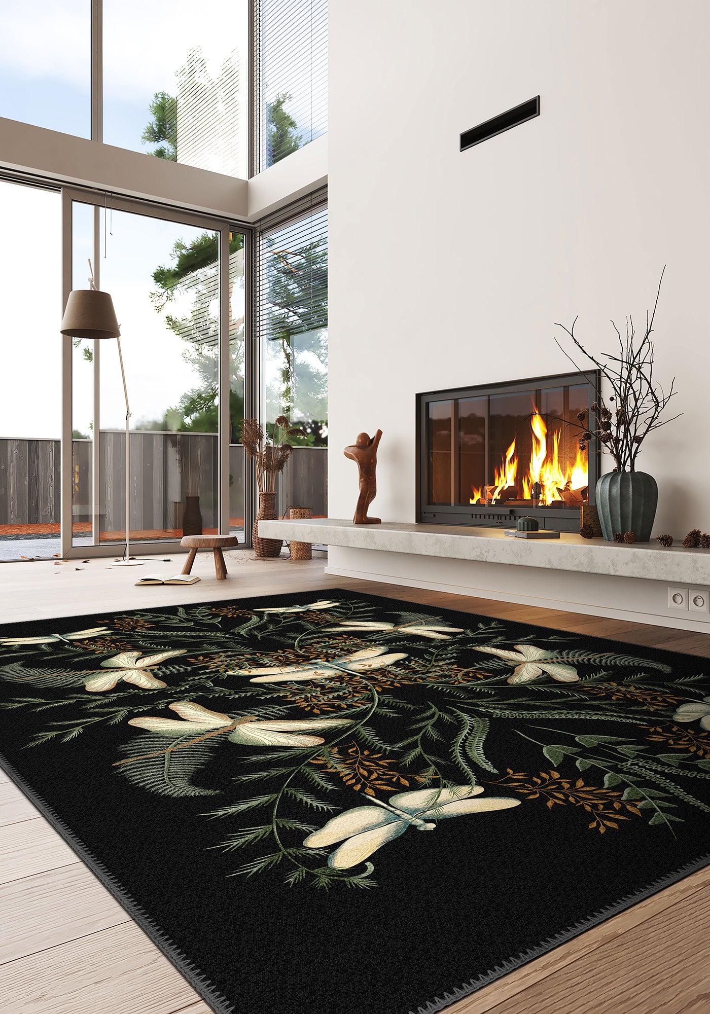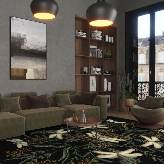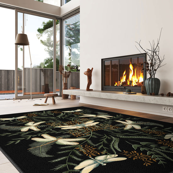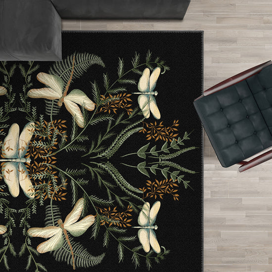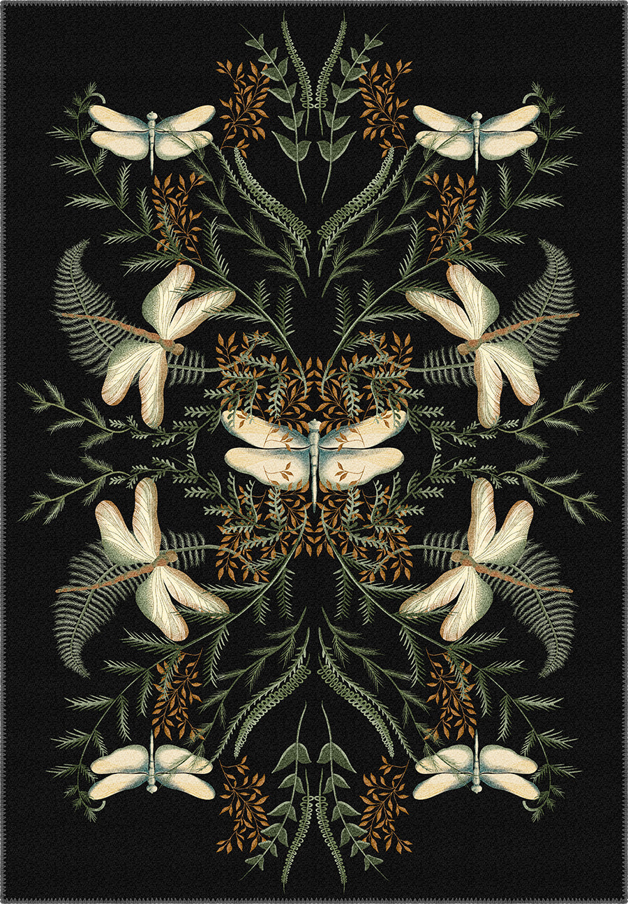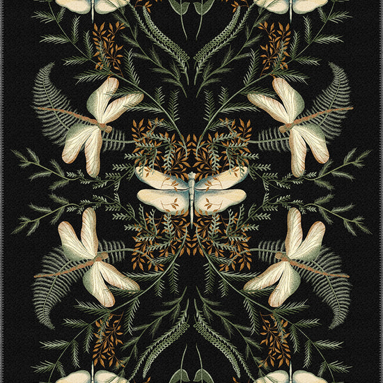 The Orithia Dragonfly Rug captures the delicate beauty of nature with a stunning composition of dragonflies, lush ferns, and intricate botanical elements. Set against a deep black background, the symmetrical design creates an enchanting visual rhythm, blending elegance with a sense of movement. The soft ivory and muted green hues bring a natural balance, making this rug a statement piece that feels both organic and refined.