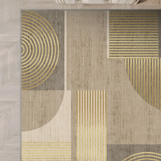 The Peyton Gold Geometric Rug brings contemporary elegance to your home. Its bold geometric design in luxurious gold tones adds a touch of glamour to any room. With its durable, machine-washable construction, this rug is ideal for modern living spaces that demand both style and practicality.