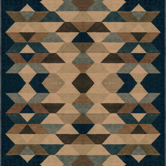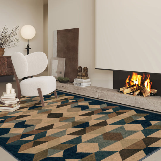 The Rivena Beige Geometric Rug brings a striking geometric pattern that combines earthy beige and deep, contrasting hues to create a standout piece for contemporary spaces. With intricate, symmetrical shapes and a fusion of warm and cool tones, this rug provides a dynamic aesthetic that elevates any room it graces.