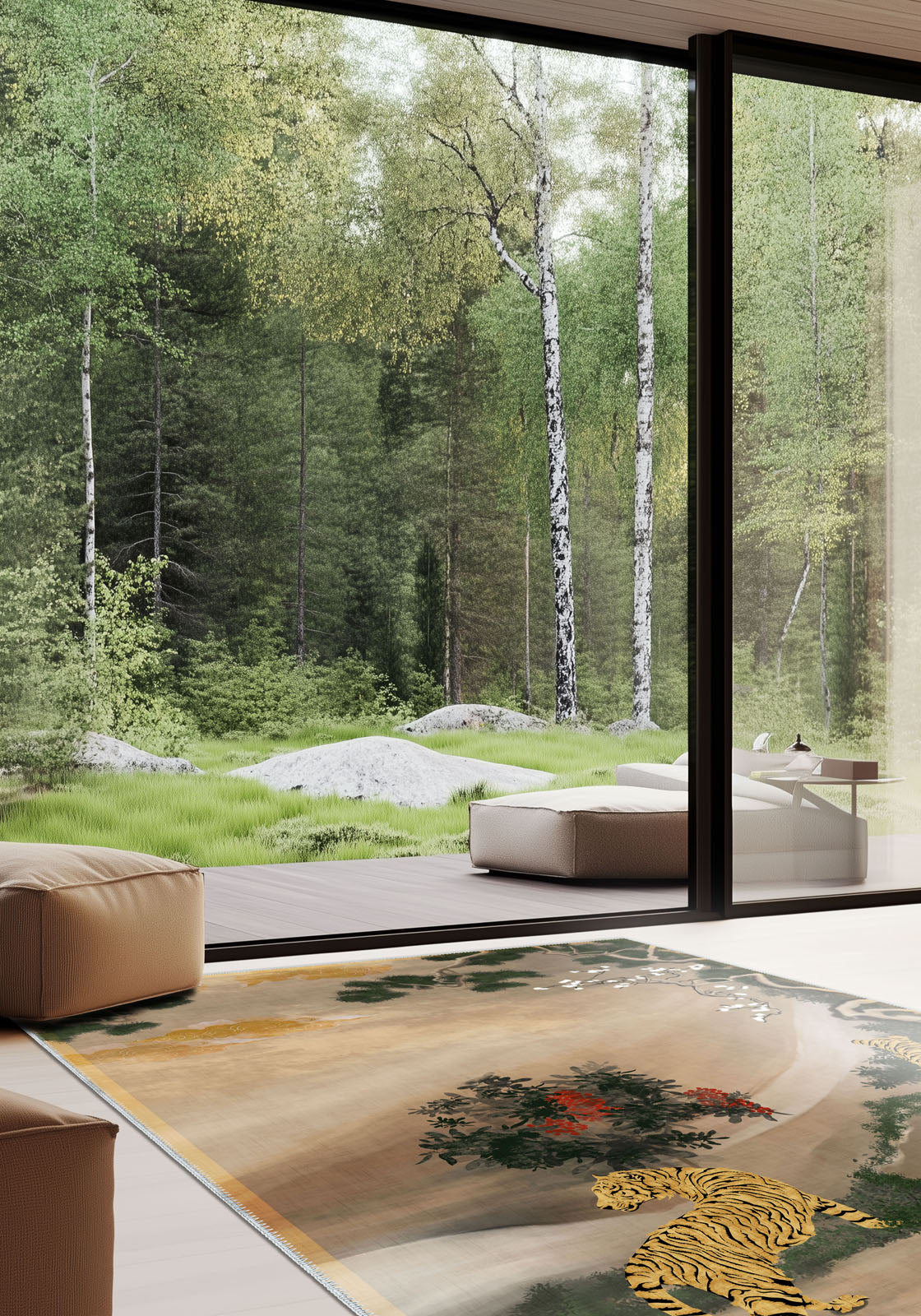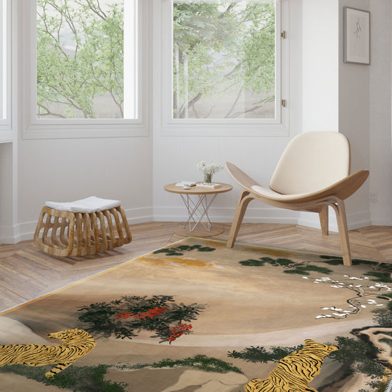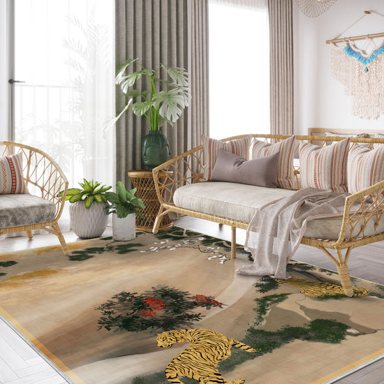 The Shan Tiger Asian Rug is a magnificent piece that brings the spirit of Eastern art and culture to your home. With its rich depiction of tigers—symbols of power and protection in Chinese folklore—set against a serene natural landscape, this rug seamlessly blends Chinese, Japanese, and broader Asian artistic traditions.